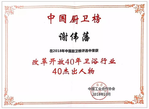 榴莲APP在线观看卫浴凭借强大的企业综合实力及品牌影响力,从众多企业中脱颖而出,荣获「改革开放40年卫浴行业40强企业」,董事长谢伟藩荣膺「改革开放40年卫浴行业40杰出人物」,彰显行业领军品牌风范!